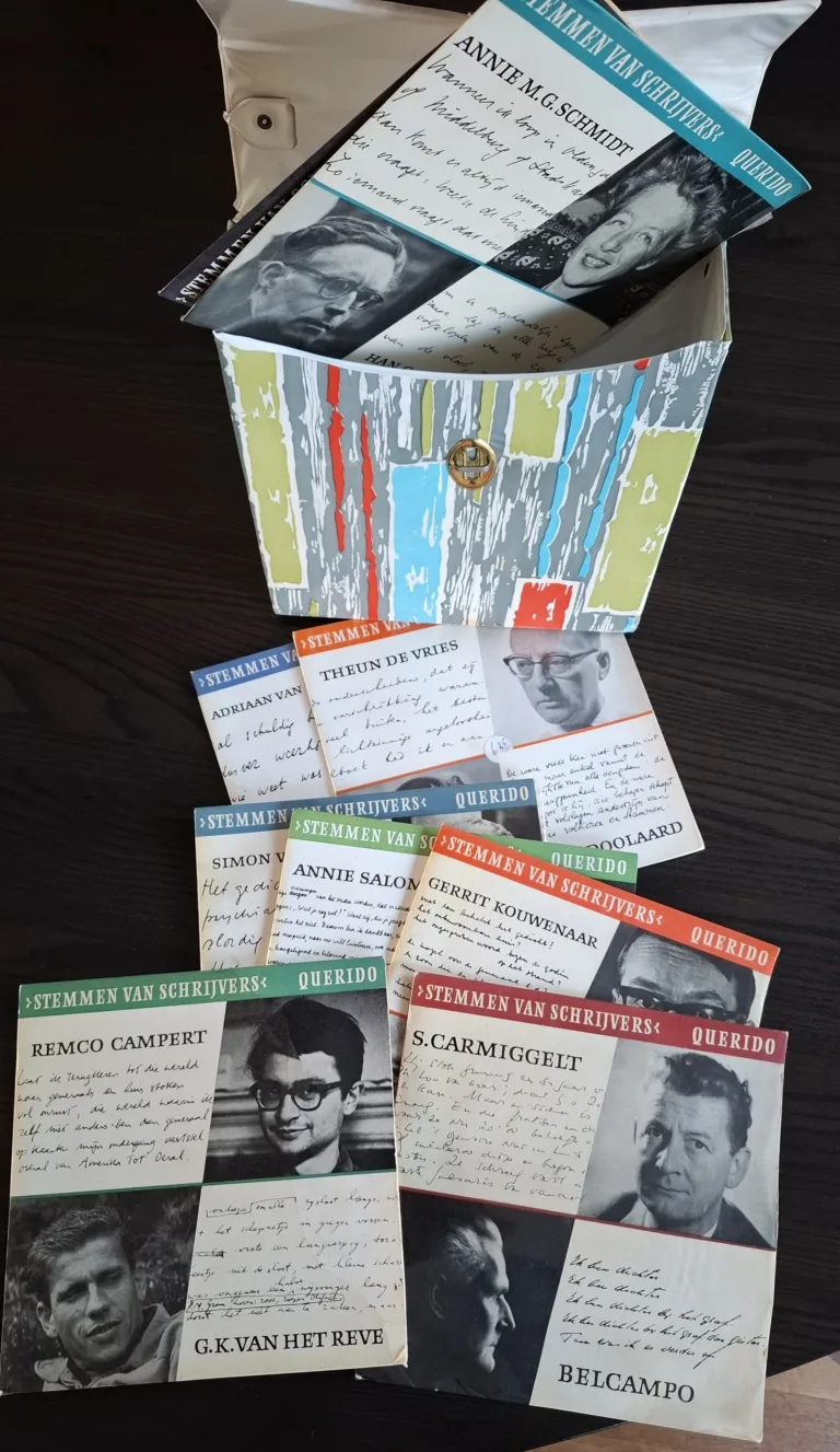 Bij het lezen van het verhelderende artikel ‘Het vinyl archief van de Nederlandse letteren’ van Mathijs Sanders dacht ik aan het vintage platenkoffertje (met perfecte sluiting) dat ik een paar geleden kocht via Marktplaats. Voor de biografie van Belcampo was ik op zoek naar het grammofoonplaatje van Carmiggelt en Belcampo uit de reeks Stemmen van Schrijvers. Zo stuitte ik op marktplaats op een koffertje met negen 45-toerenplaatjes, waaronder dat van het duo Carmiggelt/Belcampo. Bijna de helft van de twintig opnamen die uitgeverij Querido van 1960 tot 1961 uitbracht voor ƒ 6,25 per stuk. Een geweldige bijvangst was het plaatje van Remco Campert en G.K. van het Reve. Behalve een meesterlijk stilist van uiteenlopende genres en auteur van De ondergang van de familie Boslowits, het katholiek prachtboek Bezorgde Ouders en de befaamde Reisbrieven die vele auteurs hebben beïnvloed, was Reve dichter. En als dichter dient zich een andere, bijzondere kwaliteit van hem aan: zijn stem. Een stem, die de melancholische en ironische inhoud van zijn poëzie een extra lading, een extra betekenis geeft.